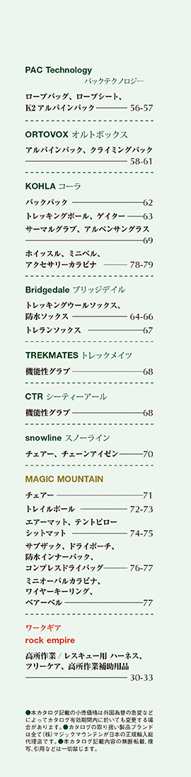 ●本カタログ記載の小売価格は外国為替の急変などによってカタログ有効期間内に於いても変更する場合があります。●カタログの取り扱い製品ブランドは全て株式会社マジックマウンテンが日本の正規輸入総代理店です。●本カタログ記載内容の無断転載、複写、引用などは一切禁じます。