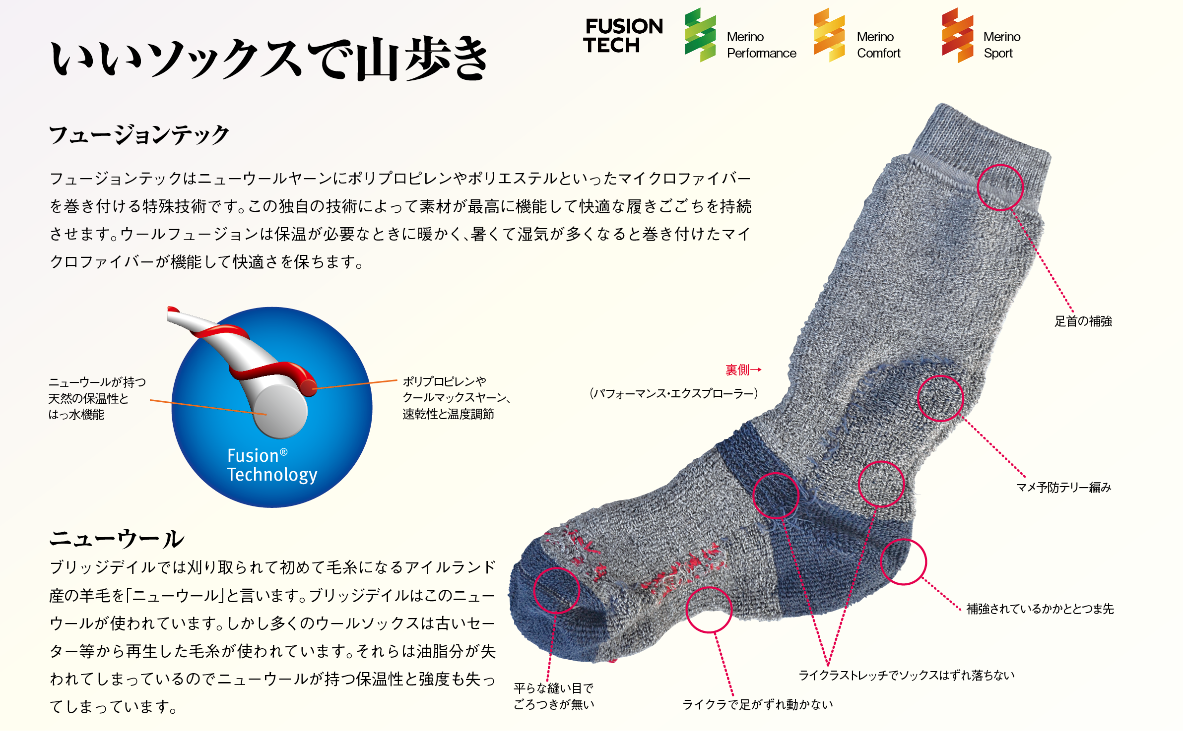 ブリッジデイルのソックスはフュージョンテックによって耐久性とウールの風合いを両立しています。